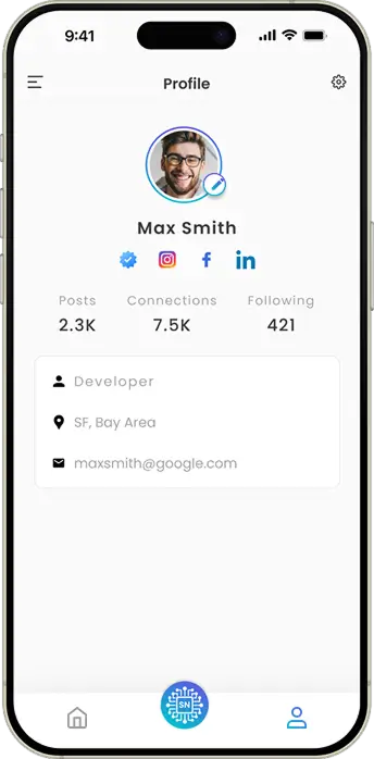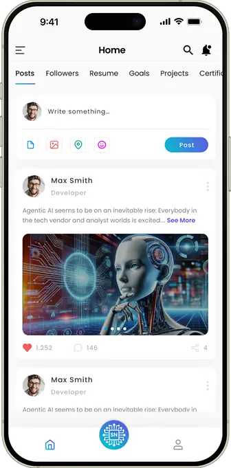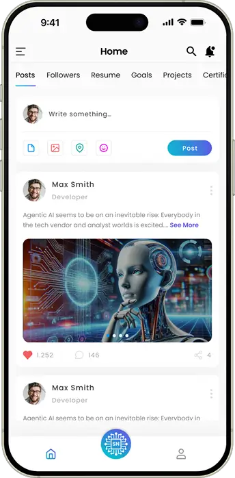 The Home screen of the Skill Nova App acts as a central hub, showing the user’s name, profile picture, and a quick post option to share updates. User-generated posts with profile info, content, and media are displayed prominently, each with interactive icons for likes and comments to boost engagement.