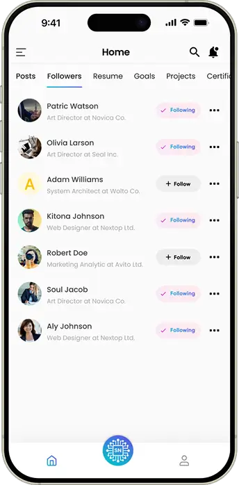 The top navigation bar allows seamless switching between key sections like Posts, Followers, Resume, Goals, and Projects, ensuring users stay connected with their career journey and network.